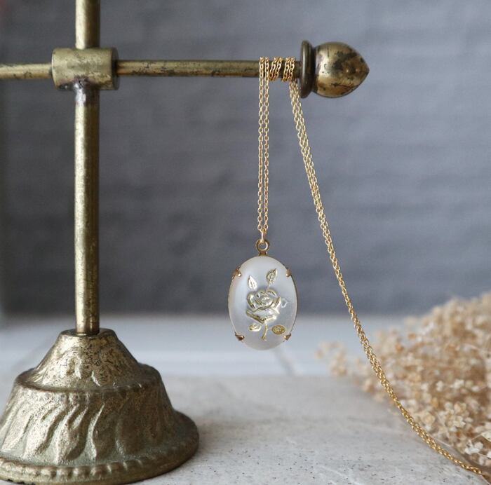 ●フロスト加工されたルーサイトカボションに薔薇をモチーフにしたゴールドフォイル装飾がモダンなデザイン。