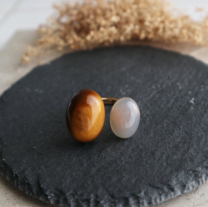 ※こちらは以前販売しておりました「イエロータイガーアイとグレーオニキスのフォークリング」のひとまわり大きいサイズになります。