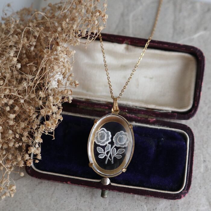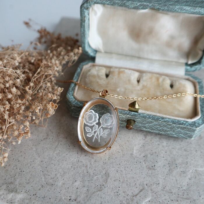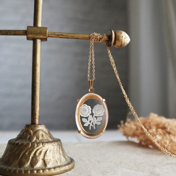 ●裏側からの薔薇の透かし彫りが施された1950年代ヴィンテージガラスのネックレス。
