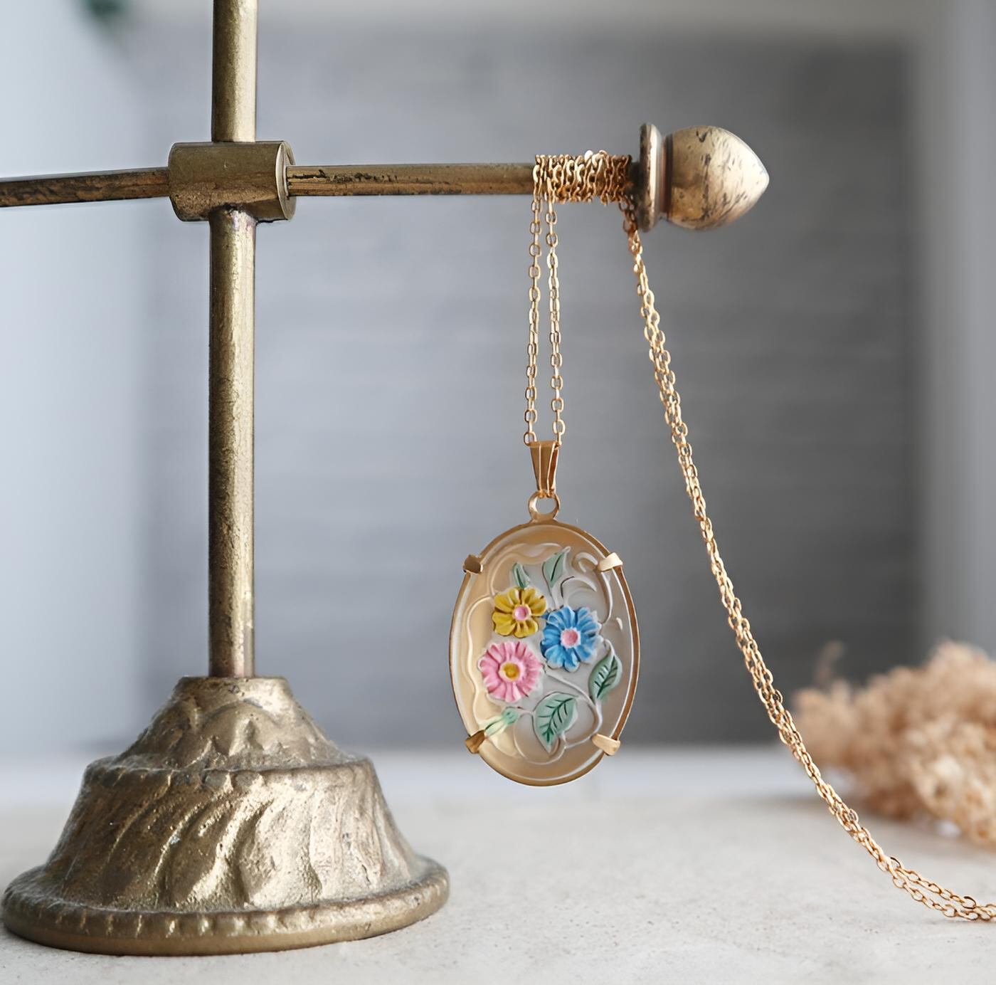 #ヴィンテージネックレス #西ドイツヴィンテージ #フロストガラス #レトロアクセサリー #花モチーフ #大人可愛い #一点物アクセサリー #アンティーク調 #サージカルステンレス #金属アレルギー対応 #春アクセサリー #クラシカルコーデ #上品アクセサリー #ナチュラルコーデ #ハンドペイント