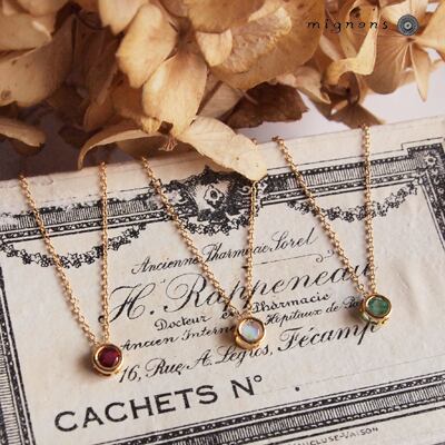 ベゼル(ゴールド枠)の中にとじ込めて華奢で繊細な一粒ネックレスに仕立てました。