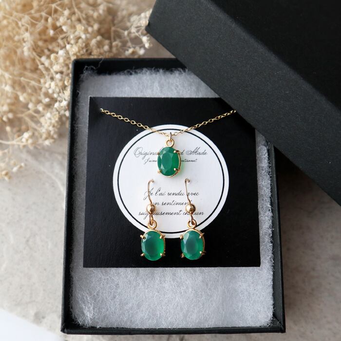 ●深いグリーンカラーの発色が美しいグリーンオニキスを『ネックレス&ピアスセット』に仕立てました。