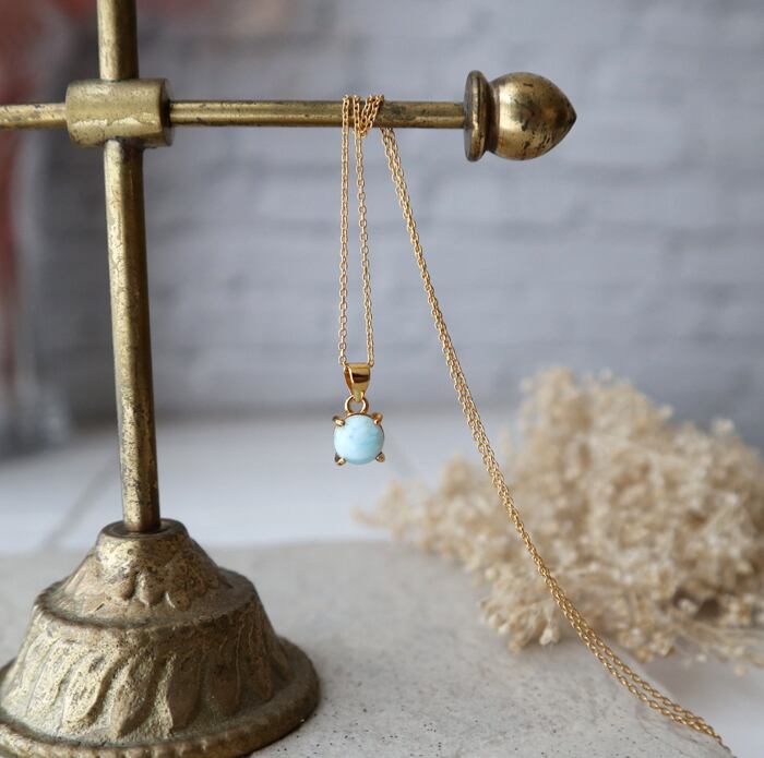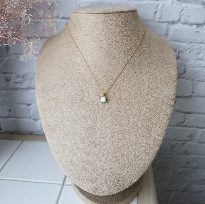 枠の中でぽってりとした質感がとても可愛らしく、小粒ながら肌に映えて存在感のある一粒ネックレスに仕立てました。
