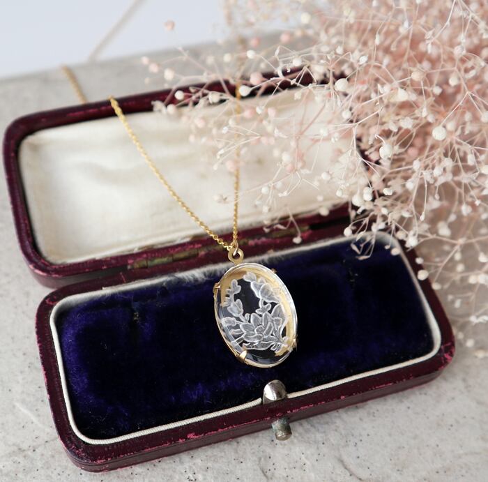 ●小さな楕円のガラスに細かく彫り込まれた、お花のリースのネックレス。