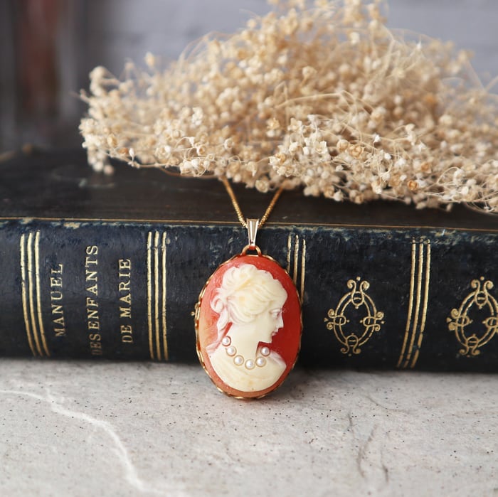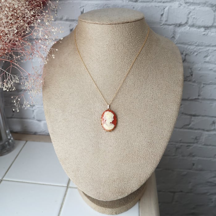 ●女性のネックレスの部分にパールが埋め込まれた日本製ヴィンテージのカメオネックレス。