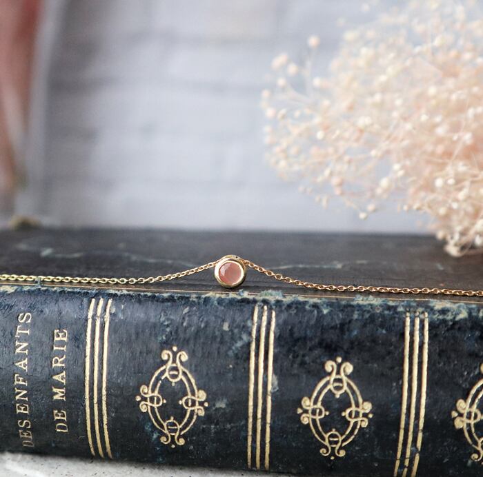 ベゼル(ゴールド枠)の中にとじ込めて華奢で繊細な一粒ネックレスに仕立てました。