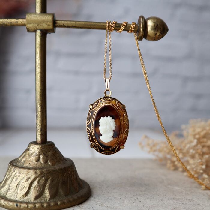 ●べっ甲模様にゴールドレースのラインが描かれた西ドイツ製ヴィンテージカメオ。