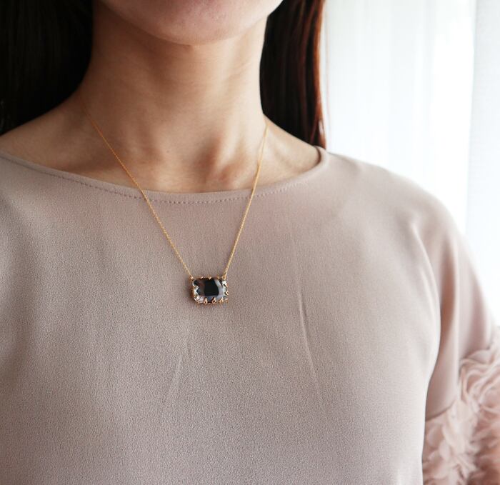 重さはそこまでなく、チェーンを少し長めに設定いたしましたので服の上から身に着けてもクラシックで素敵です。