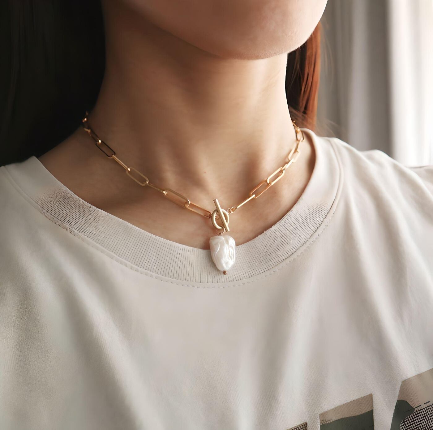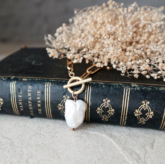 ●大粒の淡水ケシ真珠をペンダントトップに流行りのスクエアチェーンを組み合わせ。