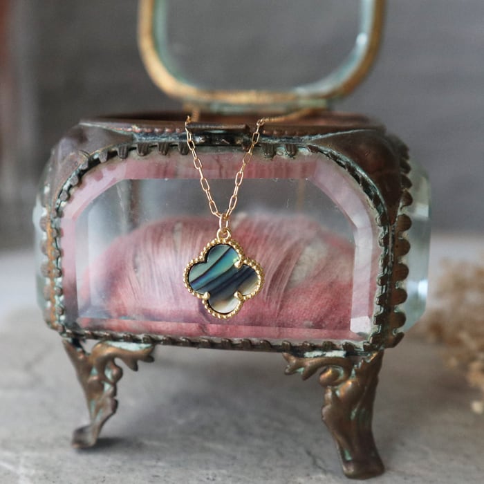 フラワー型の石枠は丁寧にミル打ちされ、シェル特有の上質な照りが角度によって青、緑、紫に変化...吸い込まれそうなほど美しいです。